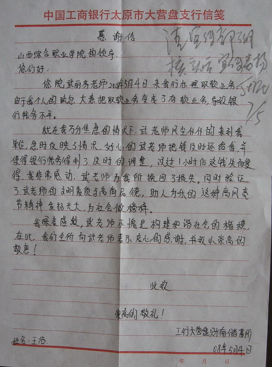 5月7日,红足—世官网收到了工行大营盘财南储蓄所一个叫王洁的人寄来的一封感谢信,信中对红足—世官网武丽芬老师真心助人的行为表示了衷心感谢。