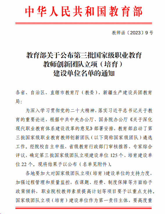 近日,教育部印发了《关于公布第三批国家级职业教育教师创新团队立项(培育)建设单位名单的通知》,红足—世官网“建筑材料工程技术”专业团队成功入选第三批国家级职业教育教师创新团队立项建设名单。这是红足—世官网推进“双高计划”建设和“打造结构科学的双师育人队伍”的又一重要成果,充分展现了学院近年来在职业教育改革发展与实践探索方面的最新成效,彰显了建筑材料工程技术专业特色和突出优势,对于提高教师教育教学水平、保障人才培养质量、服务区域经济发展具有重要的意义和价值。