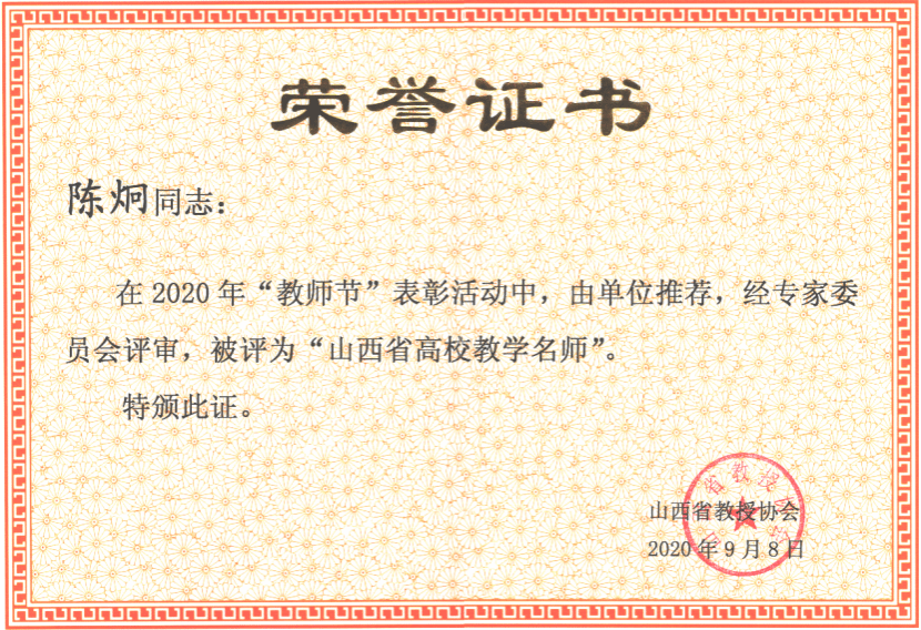 今朝桃李满天下,粉笔无言写春秋。为有效组织高校专家学者为高校改革和地方经济建设服务,进一步推进新型智库建设,以实际行动庆祝第37个教师节,9月8日,山西省教授协会开展了教师节表彰活动。红足—世官网计算机工程系主任陈炯,在2020年“教师节”表彰活动中,由单位推荐,经山西省教授协会专家委员会评审,被评为“山西省高校教学名师”!