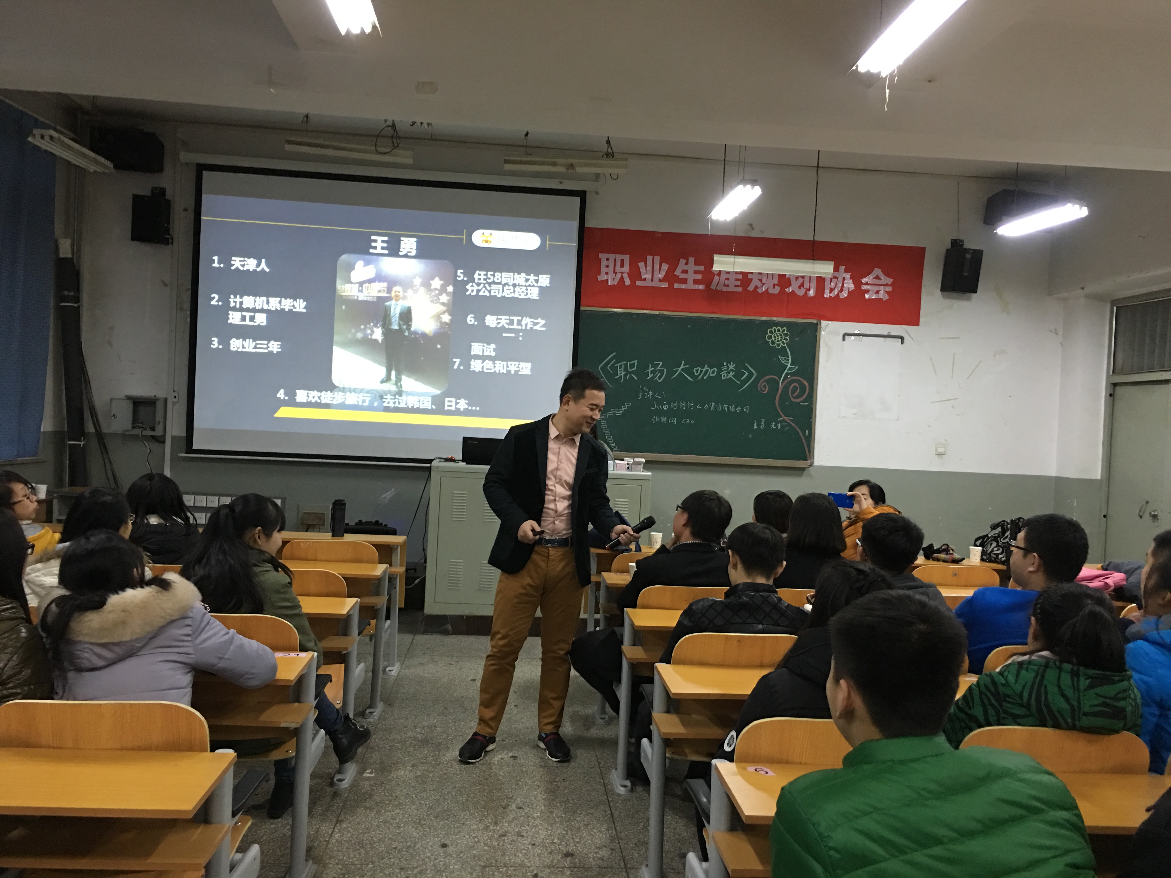 为了更好地帮助学生认识自我、了解企业、明确就业形势,12月15日下午,思政部生涯协会有幸邀请到山西行行行人力资源有限公司总经理、趣聘网CEO王勇先生做了题为《出彩职场生涯》的讲座。思政部生涯规划协会和部分感兴趣的大一新生聆听了本次讲座。王勇先生从自身经历娓娓道来,通过提问、互动、视频、游戏等形式,和学生畅聊了知己、知彼、2015就业形势、就业准备四大问题。