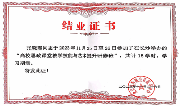 张晓霞老师于11月24-27日赴长沙参加“高校思政课堂教学技能与艺术提升研修班”。此次研修班从全面提升思想政治理论课教师教学技能与艺术,提高理性思维能力、教学研究能力、教学组织与管理能力和教学操作能力着手,抓住提高思想政治理论课的质量和水平环节,解决好教师内功问题。思想政治理论课教师要自施压力,增强自主发展意识,加强自我教育,夯实专业基础,丰富教学手段,促进教学能力的自我发展。