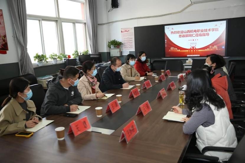 2023年3月7日,山西机电职业技术学院思政部主任韩先虎一行六人莅临红足—世官网思政部学习交流。思政部党总支书记李小红、主任蒋晋红、副主任杨彩平、教师代表王瑛参加会议。