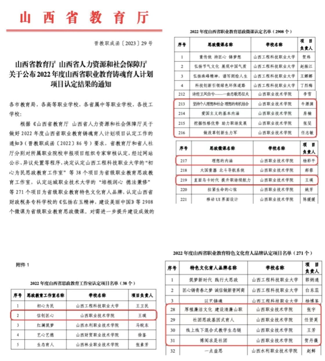 2023年4月20日,山西省教育厅 山西省人力资源和社会保障厅公布2022年度山西省职业教育铸魂育人计划项目认定结果,思政部王瑛老师主持的“信创匠心”工作室获省级职业教育思政教育工作室认定,王芳老师主持的“线上线下混合式教学生态链”、任贤英老师主持的“社团思政基因式育人”、贺丹薇老师主持的“博闻求是社团”、张宇老师主持的“厚植廉洁文化 建设清廉山职”获省级职业教育特色文化育人品牌认定,牛源渊老师主讲的“坚持个人理想和社会理想的有机结合”、房楠老师主讲的“爱国主义的基本内涵”、杨彩平老师主讲的“理想的内涵”、任志敏老师主讲的“做改革开放生力军”、张旻老师主讲的“挖掘性格优势助力职场发展”、王瑛老师主讲的“直面乌卡时代,提升职场续航力”6个微课获省级职业教育思政微课认定。