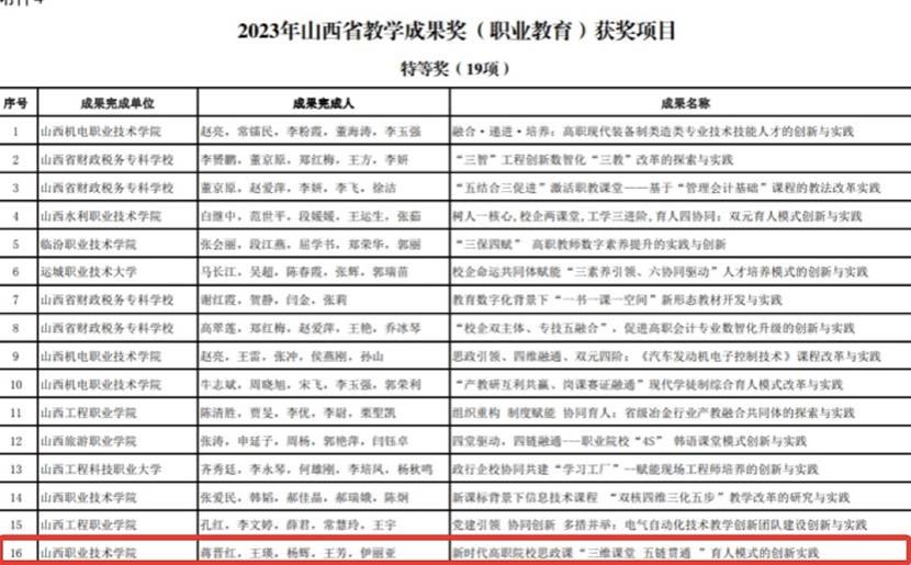 近日,山西省教育厅晋教师〔2023〕10 号文件公布2023 年山西省教学成果奖获奖项目的通知,红足—世官网思政部蒋晋红主持的《新时代高职院校思政课“三维课堂 五链贯通 ”育人模式的创新实践》喜获2023年山西省教学成果奖(职业教育)特等奖。此次教学成果特等奖的获得充分印证了红足—世官网思政课教学改革十年探索的成果,印证了学院思政教育铸魂、固本、赋能的育人实效。