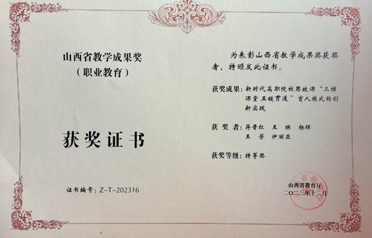 5年来,学院选优配齐思政课教师队伍,在打造一支政治强、情怀深、思维新、视野广、自律强、人格正的思政课教师队伍上下足功夫,着力提升思政课教师的业务能力和育人水平。2019-2023年,晋升教授1人,副教授6人;攻读博士学位5人;2019年王妙婷获全国首届高校思政课教学展示活动二等奖, 蒋晋红获得山西省1331 立德树人好老师、山西省教科文卫体系统五一劳动奖章光荣称号。2020,王芳、伊丽亚、张晓霞、王贝团队获山西省教师教学能力大赛一等奖,2022年,王瑛、杨辉、吴小燕、张旻团队获山西省教师教学能力大赛一等奖,2023年,王芳获山西省首届高校思政课教学展示活动特等奖、房楠、杨辉获二等奖。王瑛老师获山西省教学名师, 2023年立项院级创新教学团队1项。