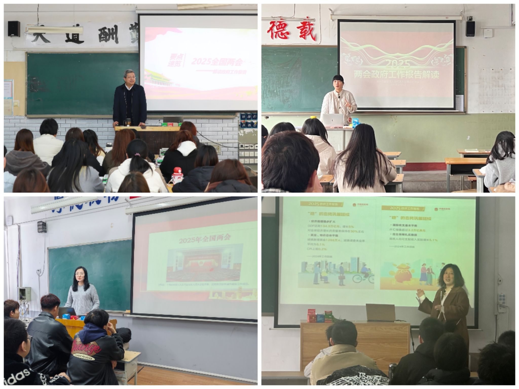 院长何秋生率先走上讲台“数”读两会,“速”读政府工作报告,结合自身的专业知识和教学经验,和同学们分享了对两会精神的理解和感悟,从经济发展目标到民生保障举措,从科技创新战略到社会治理创新,为学生进行了准确、生动的解读。思政课教师结合教学内容,以两会精神为指引,落实立德树人根本任务,聚焦坚持中国特色社会主义道路中的重大理论和现实问题,将两会精神鲜活地融入课堂教学,进一步引导青年学子将个人理想融入民族复兴伟业。