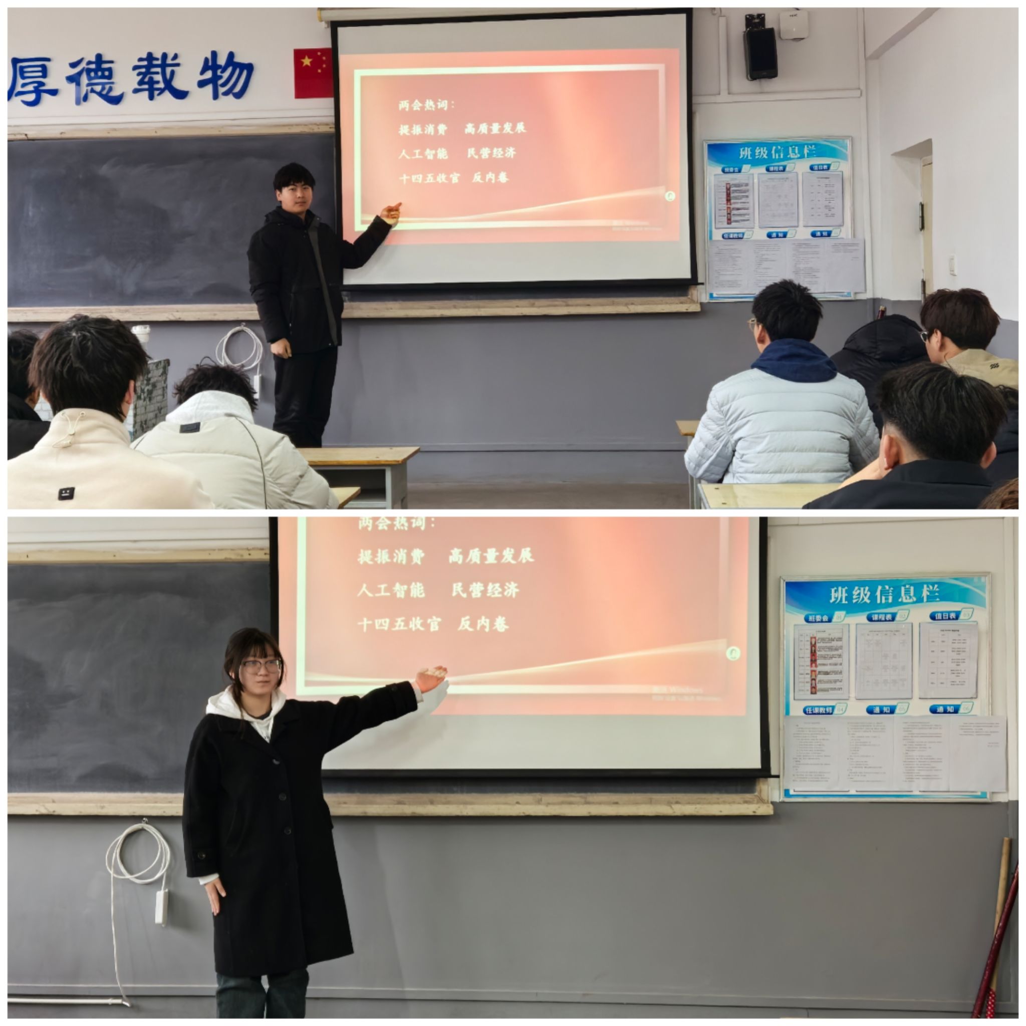 部分同学也积极走上讲台,讨论两会热词,表达自己的所感所想。两会不仅是国家政治生活的大事,关乎每个人生活的风向标,也是青年群体表达期待、凝聚共识的重要窗口。大家一致表示,对2024年经济社会发展取得的成果倍感振奋,对2025年经济社会发展充满期待,决心为建设社会主义现代化强国、建设教育强国努力奋斗。