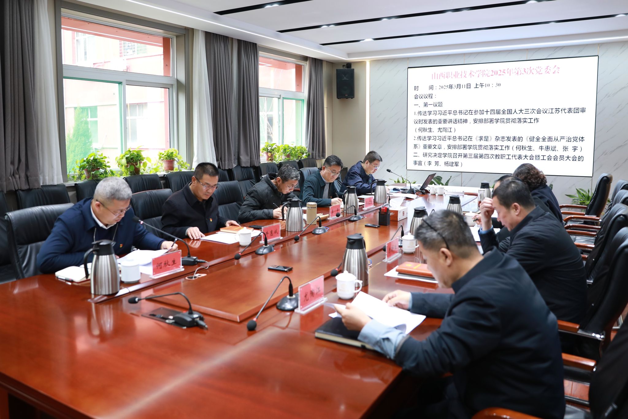 3月11日,学院党委召开2025年第三次会议,传达学习习近平总书记在参加十四届全国人大三次会议江苏代表团审议时发表的重要讲话精神和在《求是》杂志发表的《健全全面从严治党体系》重要文章,安排部署学院贯彻落实工作。党委副书记、院长何秋生主持会议,在校的党委委员参加,相关部门负责同志列席。
