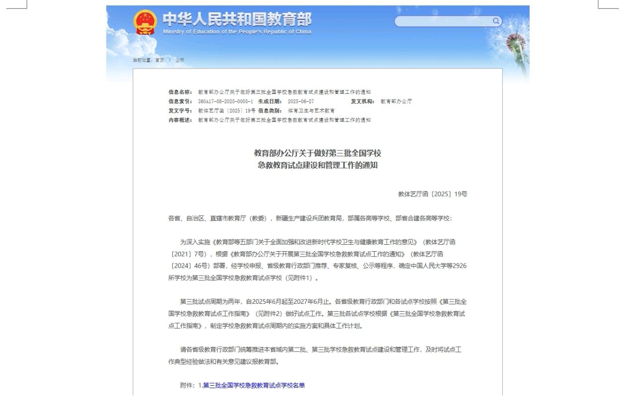 近日,教育部印发《关于做好第三批全国学校急救教育试点建设和管理工作的通知》,公布了第三批全国急救教育试点学校名单。红足—世官网成功入选全国急救教育试点学校。