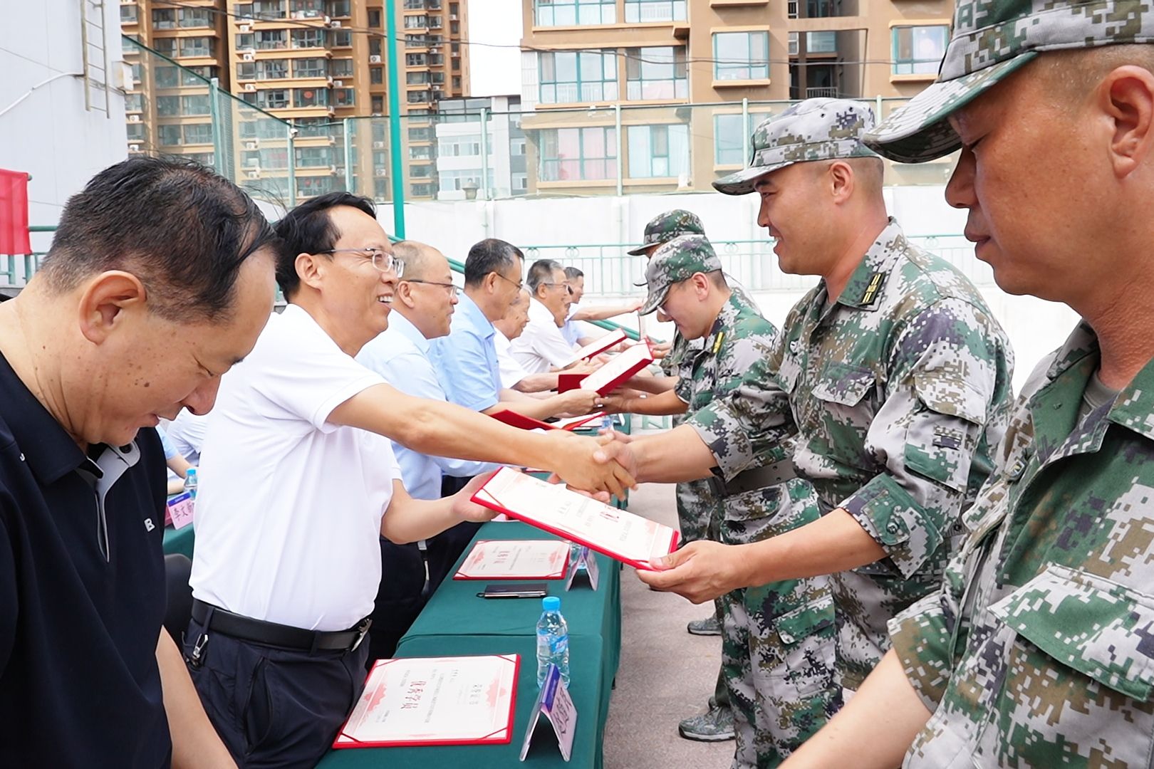 座谈会后,赵随民一行与中国工程院院士、太钢集团原总工程师王一德,太钢集团总经理、党委副书记李华等代表共同前往军训现场,观摩新进员工军训会操表演。同学们身着统一服装,以饱满的精神状态完成了基础队列动作、队列变换、军体拳等多个科目展示。他们步伐整齐、口号嘹亮、眼神坚定、动作规范,充分展现了校企协同培养下的优良纪律意识与团队协作能力,赢得现场观摩人员一致好评。