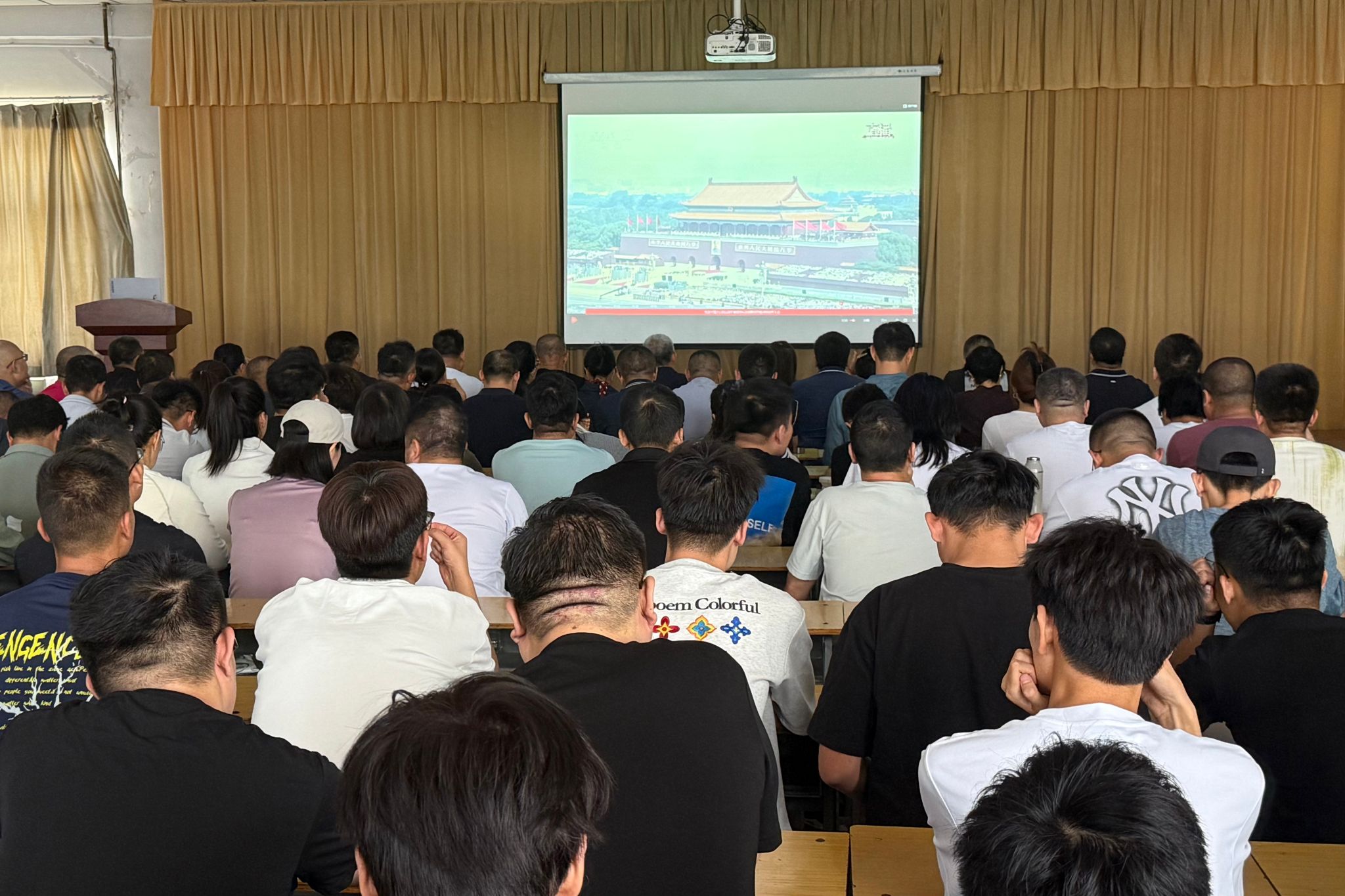 学院集中观看现场。伴随着雄壮的国歌旋律,全体起立,齐唱国歌,庄重肃穆的氛围笼罩全场。随着直播镜头切换,看着整齐划一的方阵昂首阔步,师生们心潮澎湃,不约而同地送上热烈掌声,用诚挚的情感向祖国致敬。