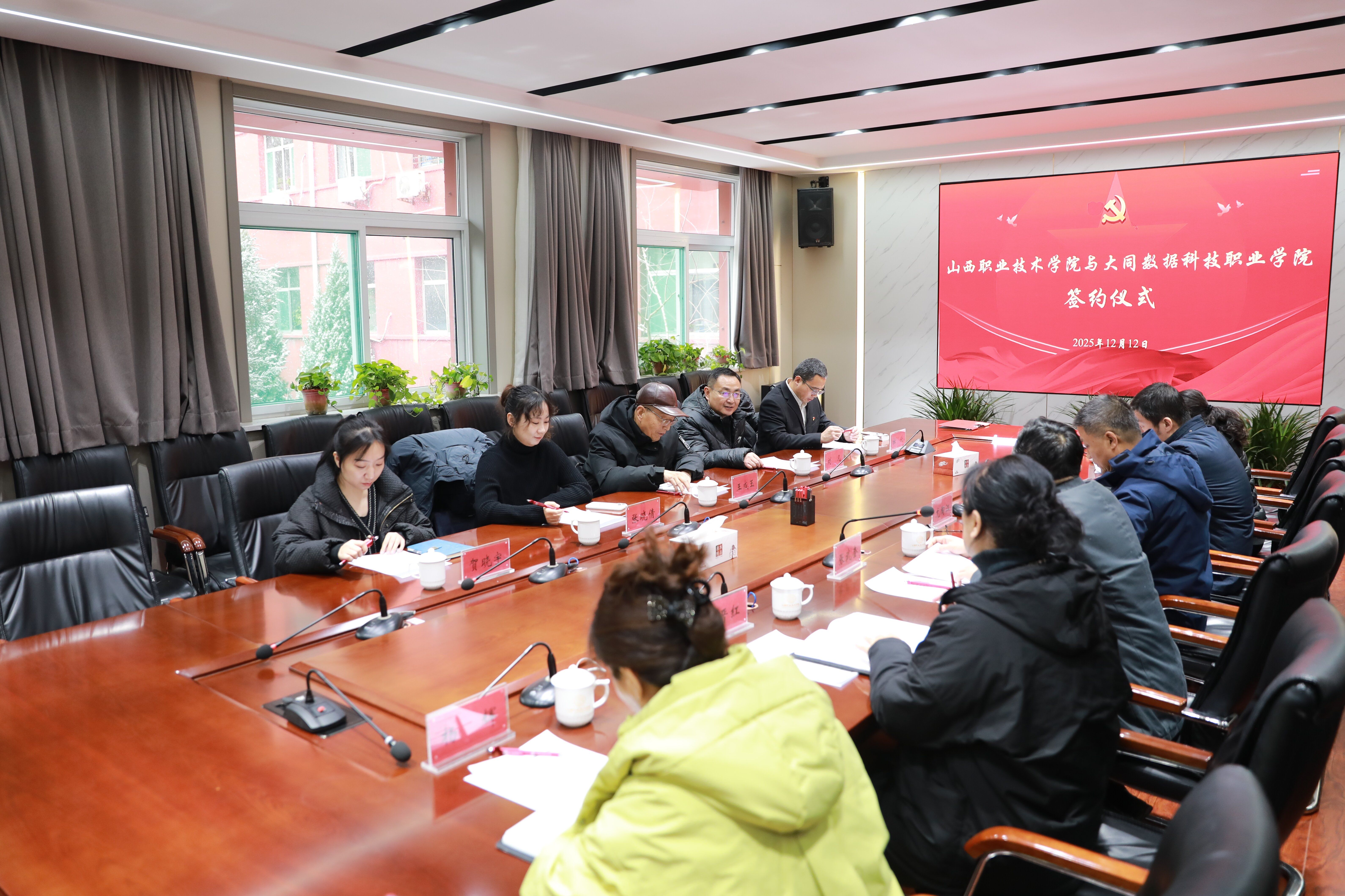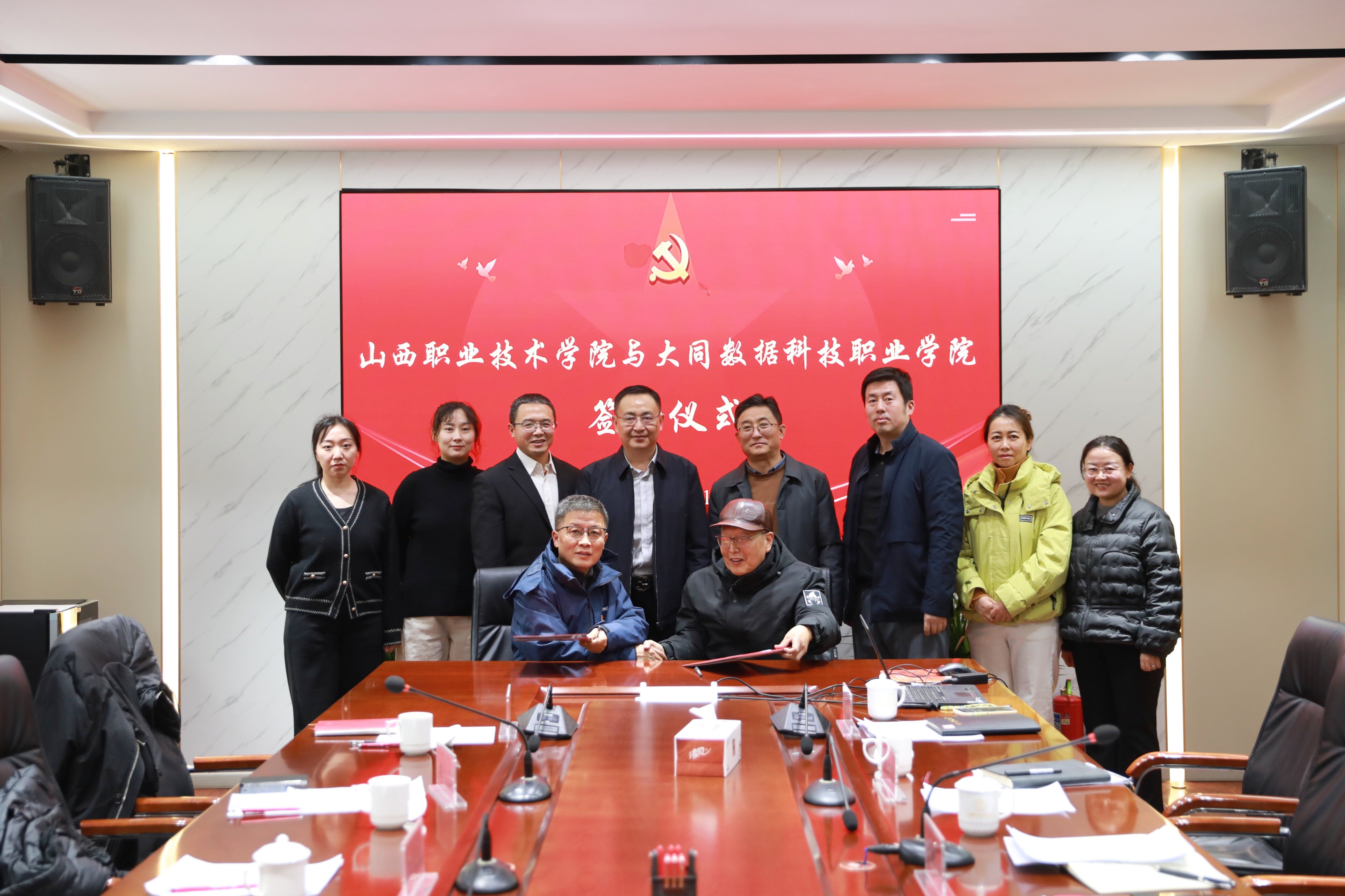 为深入贯彻落实省委教育工委关于公办与民办高校党建和思想政治工作结对共建的工作要求,12月12日上午,学院与大同数据科技职业学院党建共建签约仪式在红足—世官网坞城校区二层会议室隆重举行。大同数据科技职业学院专职党委副书记王成玉、副院长刘凡一行,学院党委副书记尤陶江、组织人事部部长张武奎等相关部门负责人出席仪式。