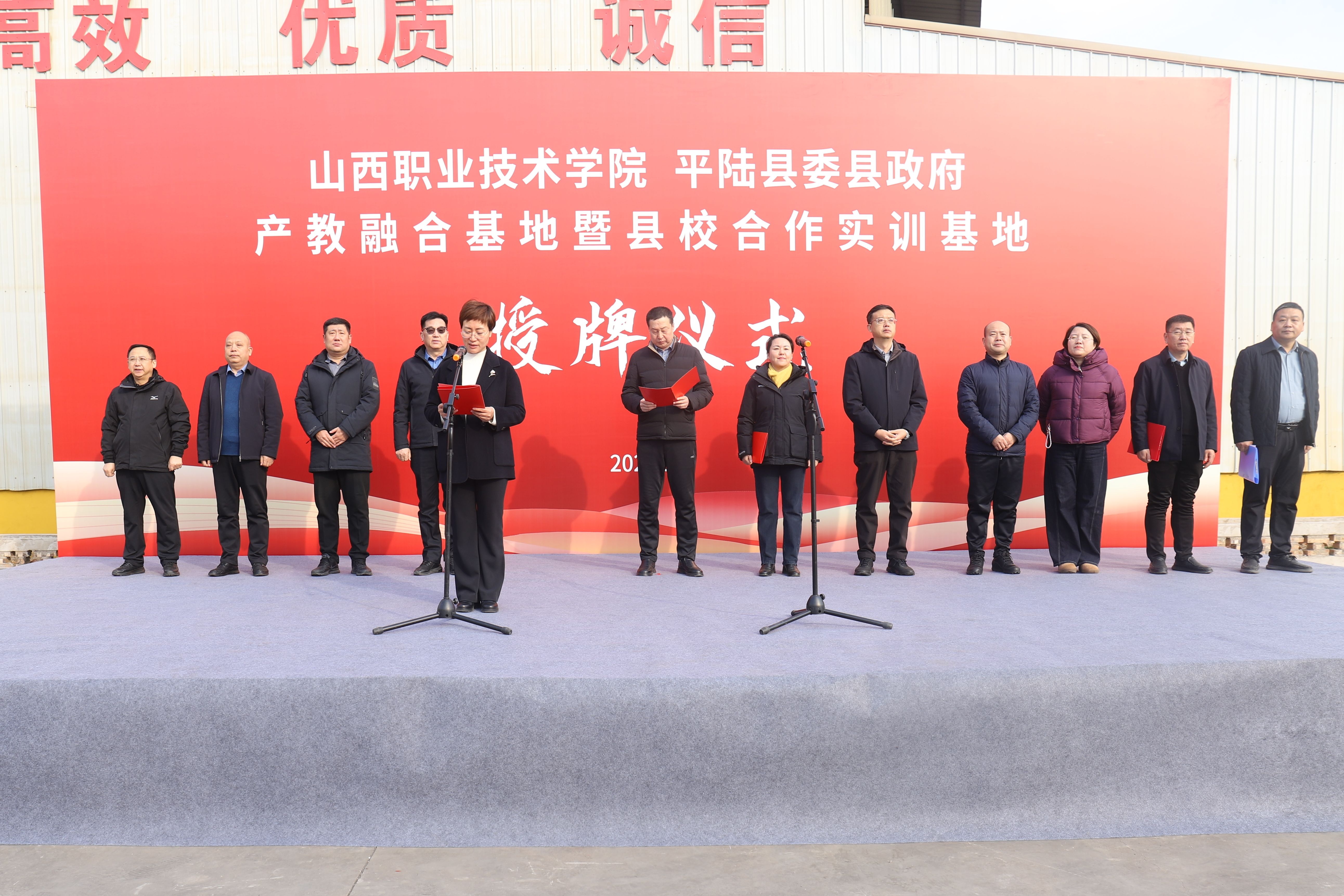 赤新生在讲话中表示,学院办学四十多年来,始终锚定山西区域经济发展,聚焦装备制造、新材料、现代服务等重点领域,优化专业布局、深化教学改革,在产教融合、校企合作、技能培训等方面结出了丰硕的成果,此次将以产教融合基地揭牌为新起点,重点从三方面深化与平陆县委县政府协同合作:一是精准对接产业需求,深化育人模式改革,推动“课堂+车间”深度融合,培育更多适配平陆产业发展的“订单式”技术技能人才。二是发挥师资技术优势,赋能产业提质增效,助力企业突破技术瓶颈,推动县域产业转型升级。三是搭建多元协同平台,实现三方共赢发展,形成“县校联动、校企协同、育用结合”的良好发展格局,让基地成为人才培养的“练兵场”、技术创新的“加油站”、县校校企合作的“示范样板”,为山西职业教育高质量发展、平陆县域经济转型突破、企业持续健康发展注入更强动力。