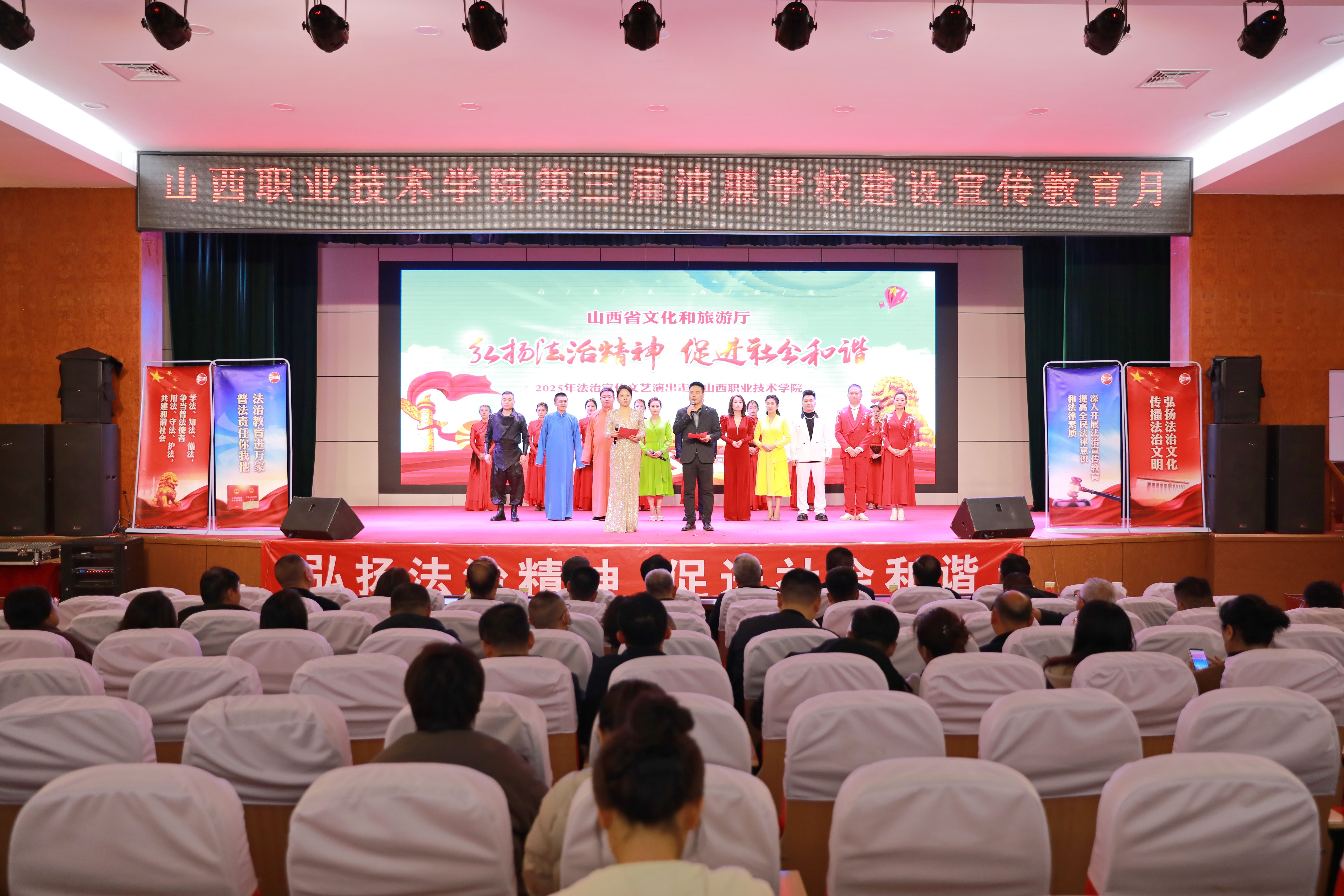 近年来,学院始终高度重视清廉学校建设,不断创新工作方式,大力弘扬清廉之风,全力推动寓廉于教的教育生态,将廉洁文化建设融入院系两级建设,全方位打造廉洁文化阵地。第三届清廉学校建设宣传教育月活动在由山西省文化和旅游厅主办,学院党政办公室、纪委办公室、团委、学工部联合承办的法治宣传文艺演出进校园活动中拉开帷幕,学院党委书记赵随民出席活动并致辞,师生齐聚一堂,在精彩纷呈的演出氛围中共同开启了为期一个月的清廉学校建设宣传教育月系列活动盛宴。