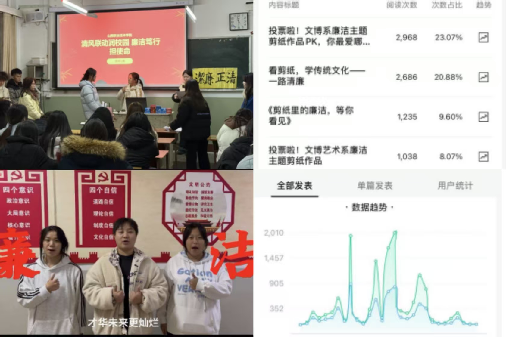 本次活动分别面向全体学生、全体党员、教职工和全体师生三个层级开展12项活动,载体丰富、形式多样、内涵深刻。各级党组织积极响应,精心组织,师生热情参与,佳作纷呈,亮点频现,通过“三会一课”、主题党日等形式,组织师生开展廉政谈话、警示教育、制度学习、廉洁教育专题讲座、主题班团活动、学生干部廉洁知识培训等活动,使廉洁意识深入人心。同时,创新性地引入了廉洁知识问答、微网课录制等新颖形式,极大地激发了师生的参与热情和创造力。其中,组织师生开展在线廉洁知识问答参与人数9825人次,征集各类廉政作品1767件,参与师生10059人次,全员参与、全域贯通的清廉学校建设工作格局逐步形成。
