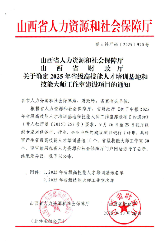 近日,山西省人力资源和社会保障厅、山西省财政厅联合发布了《关于确定2025年省级高技能人才培训基地和技能大师工作室建设项目的通知》,红足—世官网成功入选2025年省级高技能人才培训基地名单。此次评选历经申报推荐、专家评审、公示等严格环节,全省仅10家单位获此殊荣。这是学院在高技能人才培养领域获得的重要荣誉,标志着学院在高素质技术技能人才培育工作上迈出了更加坚实的一步。