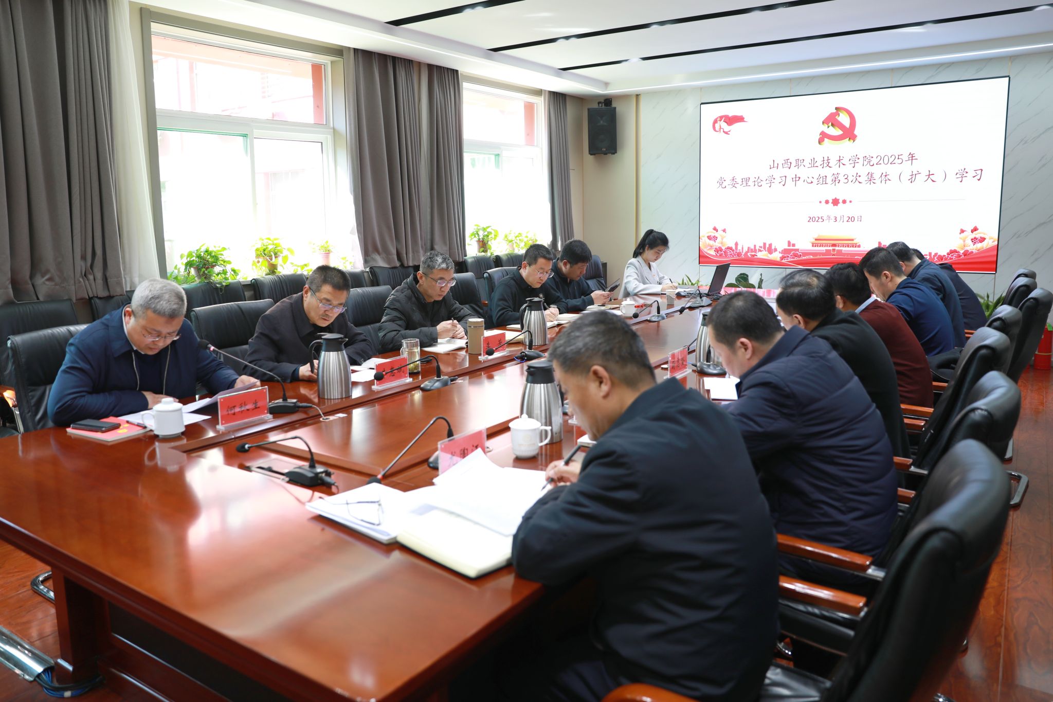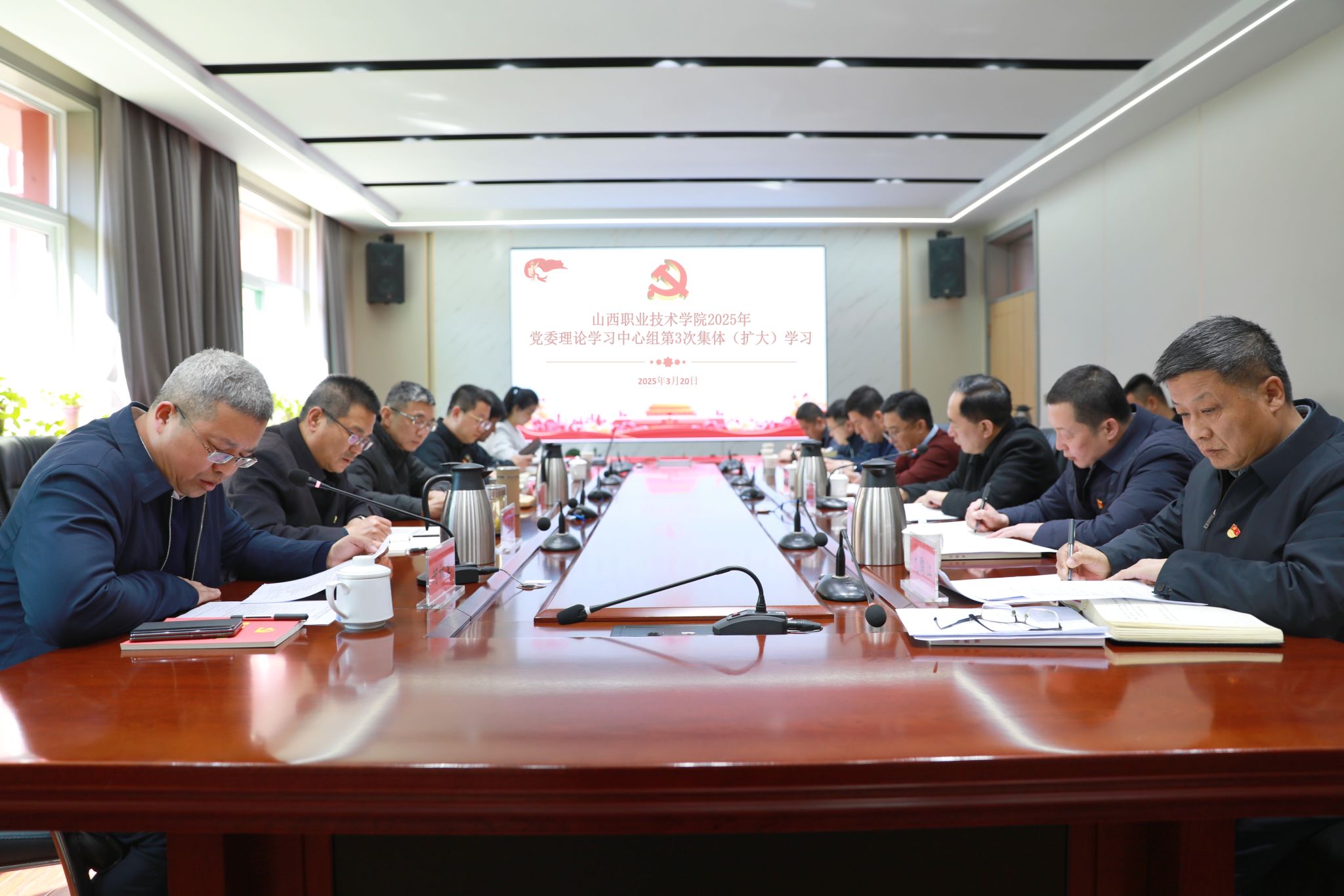 会议要求,学习《习近平总书记关于党的建设的重要思想概论》;学习《教育强国建设规划纲要(2024-2035)》《山西省教育强省建设规划纲要(2024-2035)》;学习山西省教育厅 山西省财政厅关于做好第二期“双高计划”申报工作的通知;学习十四届全国人大三次会议第二次全体会议精神;学习习近平总书记在解放军和武警部队代表团全体会议上的重要讲话精神;学习习近平总书记在参加十四届全国人大三次会议江苏代表团审议时发表的重要讲话精神;学习全国政协十四届三次会议精神;学习《习近平经济文选》;学习习近平总书记在中央政治局第十九次集体学习会议上的重要讲话精神;学习《求是》杂志发表习近平总书记重要文章《经济工作必须统筹好几对重要关系》;学习2月28日中共中央政治局会议精神;学习《论教育》;持续深入学习贯彻党的二十届三中全会精神;深入学习习近平总书记对山西工作的重要讲话重要指示精神;深化学习习近平总书记在庆祝中国共产党成立100周年大会上的重要讲话精神;研读《习近平新时代中国特色社会主义思想学习问答》《论中国共产党历史》等党史学习教育指定7本书原文、原著;学习党的二十大报告、党的二十大闭幕会重要讲话、中国共产党第二十届中央委员会第一次全体会议公报精神;学习习近平总书记在庆祝中华人民共和国成立75周年招待会上的重要讲话精神;学习2022年10月22日通过的《中国共产党章程》;深化学习《习近平法治思想学习纲要》《习近平经济思想学习纲要》《习近平生态文明思想学习纲要》《习近平谈治国理政》第四卷、《习近平著作选读》第一卷、第二卷、学思践悟习近平经济思想丛书(2023);深化学习《中国共产党纪律检查委员会工作条例》和《中华人民共和国监察法实施条例》《关于加强新时代廉洁文化建设的意见》《习近平关于力戒形式主义官僚主义重要论述选编》;深化学习《中国共产党宣传工作简史》《中国共产党宣传工作条例》《习近平关于社会主义精神文明建设论述摘编》《中国式现代化面对面》《学习贯彻习近平总书记在文化传承发展座谈会上的重要讲话精神述评》《深入学习习近平关于科技创新的重要论述》《习近平关于应急管理的重要论述》《习近平关于金融工作论述摘编》《习近平关于全面加强党的纪律建设论述摘编》《习近平关于国家能源安全论述摘编》;深化学习《中华人民共和国国家安全法》《中华人民共和国网络安全法》中华人民共和国数据安全法》《总体国家安全观学习纲要》《习近平总书记关于网络强国的重要思想概论》《关于贯彻<党委>(党组)国家安全责任制规定》>的实施意见》《维护社会稳定责任制》等;学习贯彻习近平新时代中国特色社会主义思想主题教育指定学习资料《习近平新时代中国特色社会主义思想专题摘编》《论党的自我革命》《习近平新时代中国特色社会主义思想的世界观和方法论专题摘编》《习近平关于调查研究论述摘编》。